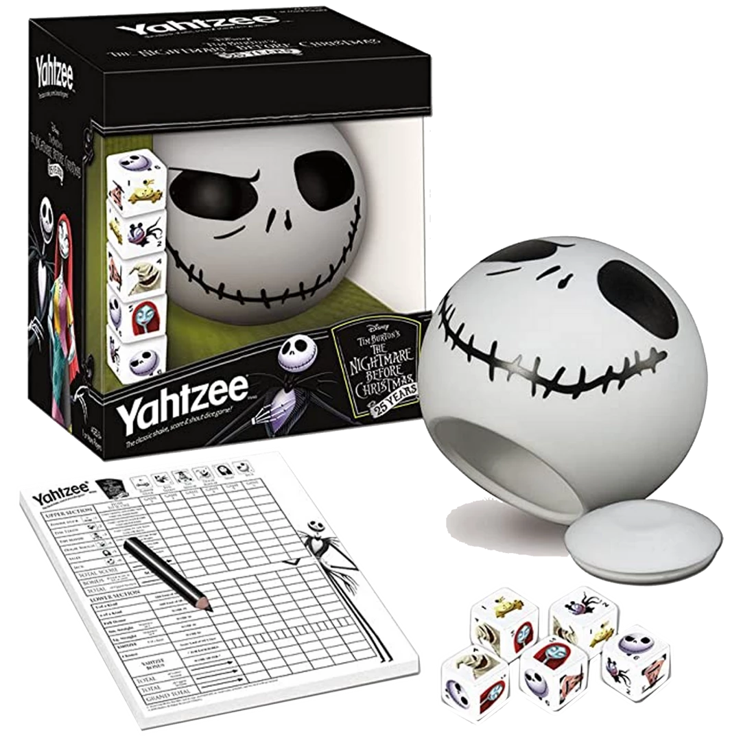 Play America’s all-time #1 dice game and celebrate 25 years of a cult classic with the Nightmare Before Christmas Yahtzee. Ready for you to shake it up are custom dice featuring frightful movie characters including the Mayor, Oogie Boogie, Sally and the Pumpkin King himself.