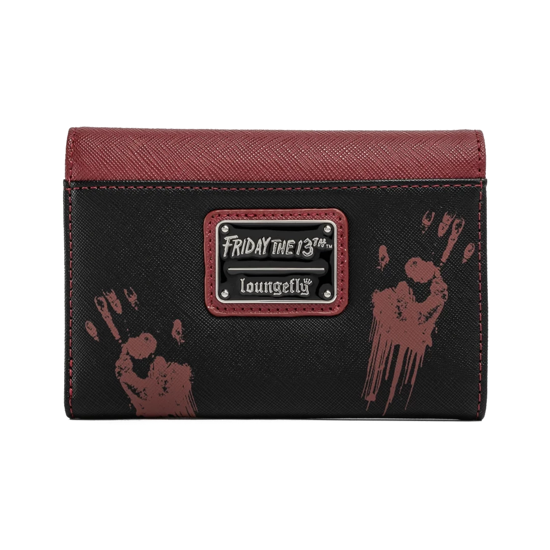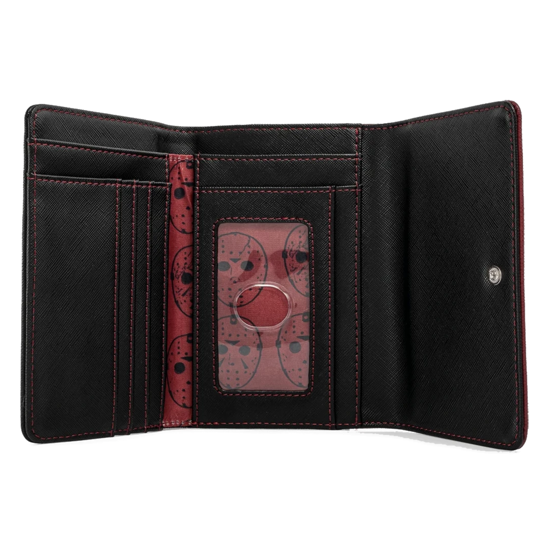 No need to wait for Friday the 13th! The Loungefly Friday the 13th Jason Mask Tri-Fold Wallet is here to put the fear in your collection. On the front a center is Jason’s hockey mask (glows in the dark) which is framed by a pick axe, machete, pitch fork, and axe. It’s a striking design making it an appealing accessory for Halloween-themed outfits.