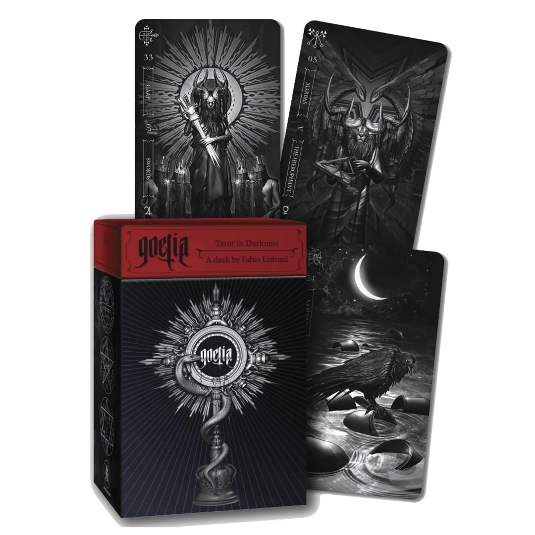 This deck is a masterpiece of deep art inspired by the esoteric lore of the Lesser Key of Salomon. Teeming with demons and spirits and rendered in a subdued palette of greys and blacks, this stark imagery pierces through to the innermost spirit of the reader. Designed to show that darkness is nothing if not a path to the light, the Goetia: Tarot in Darkness also reveals that the unconscious is nothing if not a mirror of your true conscious self.