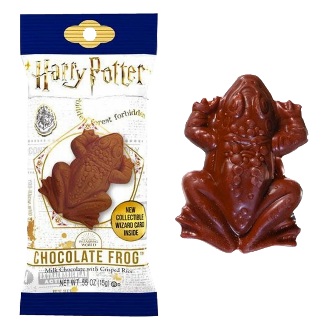 Straight from the Wizarding World of Harry Potter. A chocolate frog for all to enjoy. Delicious milk chocolate with crispy rice mixed through out. Candy frog comes with new collectible card featuring legendary wizards and witches from the books and movies.